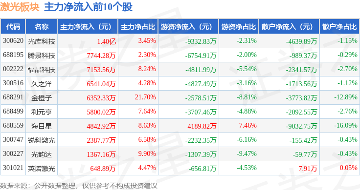 从资金流向上来看,当日激光板块主力资金净流入7697.6万元,游资资金净流出1.75亿元,散户资金净流入9823.04万元。激光板块个股资金流向见下表: