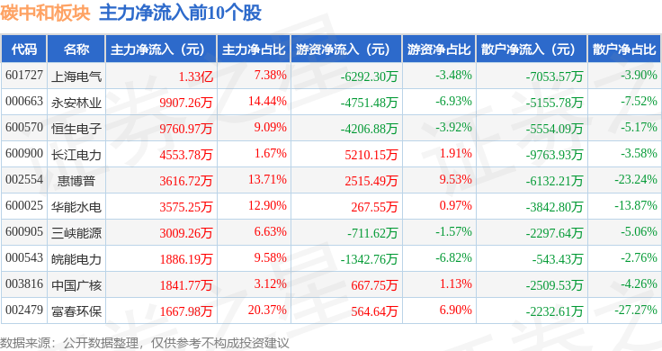 从资金流向上来看,当日碳中和板块主力资金净流出10.24亿元,游资资金净流入5.72亿元,散户资金净流入4.52亿元。碳中和板块个股资金流向见下表: