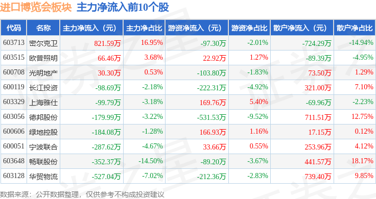 从资金流向上来看,当日进口博览会板块主力资金净流出4448.65万元,游资资金净流入718.05万元,散户资金净流入3730.6万元。进口博览会板块个股资金流向见下表: