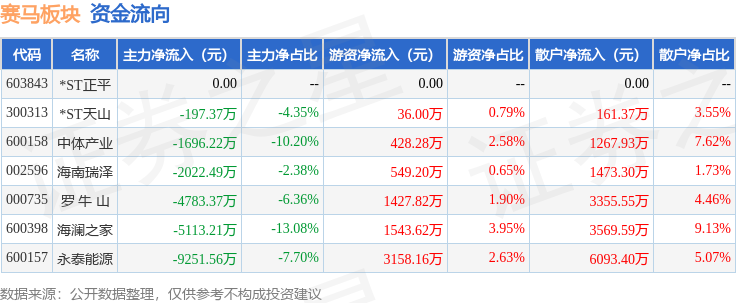 从资金流向上来看,当日赛马板块主力资金净流出2.31亿元,游资资金净流入7143.09万元,散户资金净流入1.59亿元。赛马板块个股资金流向见下表: