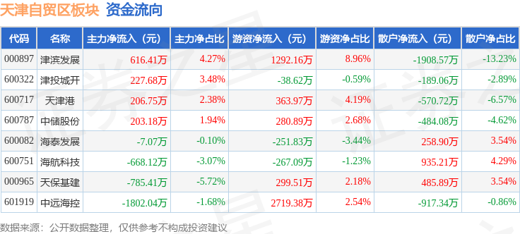 从资金流向上来看,当日天津自贸区板块主力资金净流出2008.61万元,游资资金净流入4398.38万元,散户资金净流出2389.77万元。天津自贸区板块个股资金流向见下表: