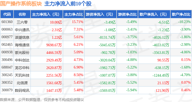 从资金流向上来看,当日国产操作系统板块主力资金净流入3.81亿元,游资资金净流出4.21亿元,散户资金净流入3984.62万元。国产操作系统板块个股资金流向见下表: