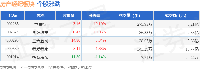 证券之星消息,11月24日房产经纪板块较上一交易日上涨3.27%,世联行领涨。当日上证指数报收于3836.77,上涨0.05%。深证成指报收于12585.08,上涨0.37%。房产经纪板块个股涨跌见下表: