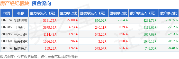 从资金流向上来看,当日房产经纪板块主力资金净流入1.13亿元,游资资金净流入515.88万元,散户资金净流出1.18亿元。房产经纪板块个股资金流向见下表: