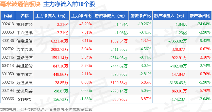 从资金流向上来看,当日毫米波通信板块主力资金净流出5.08亿元,游资资金净流入209.38万元,散户资金净流入5.06亿元。毫米波通信板块个股资金流向见下表: