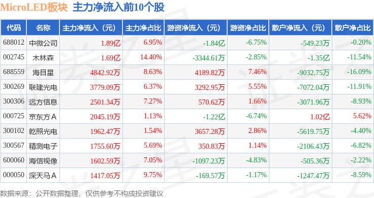 从资金流向上来看,当日MicroLED板块主力资金净流入2.55亿元,游资资金净流出2.4亿元,散户资金净流出1426.69万元。MicroLED板块个股资金流向见下表:
