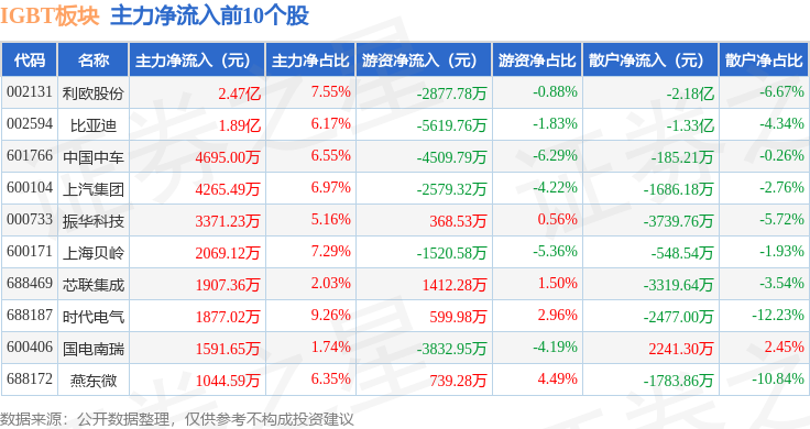 从资金流向上来看,当日IGBT板块主力资金净流出8.73亿元,游资资金净流入4536.2万元,散户资金净流入8.28亿元。IGBT板块个股资金流向见下表: