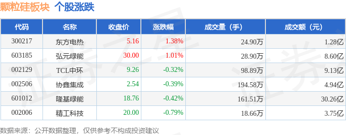 从资金流向上来看,当日颗粒硅板块主力资金净流出1.94亿元,游资资金净流入9456.81万元,散户资金净流入9893.92万元。颗粒硅板块个股资金流向见下表: