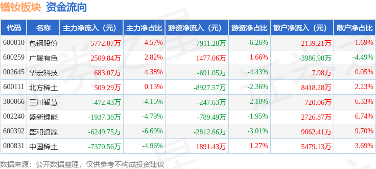 从资金流向上来看,当日镨钕板块主力资金净流出6555.85万元,游资资金净流出1.8亿元,散户资金净流入2.46亿元。镨钕板块个股资金流向见下表: