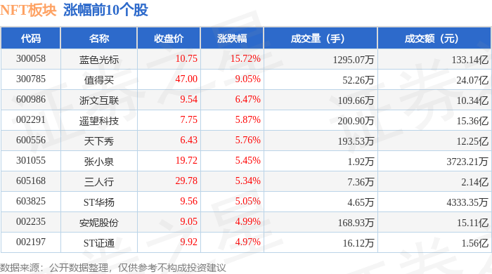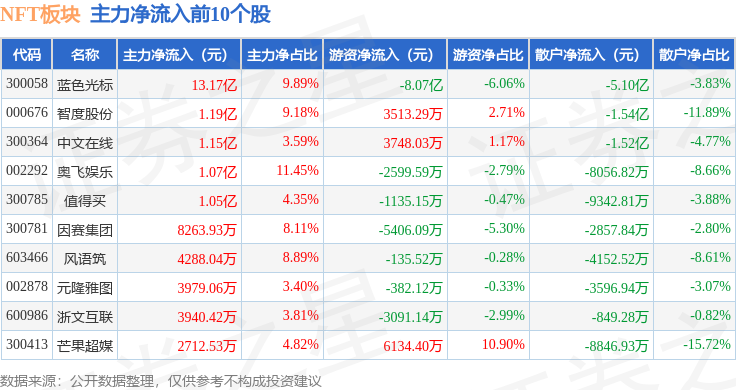 从资金流向上来看,当日NFT板块主力资金净流入6.82亿元,游资资金净流出8.99亿元,散户资金净流入2.18亿元。NFT板块个股资金流向见下表: