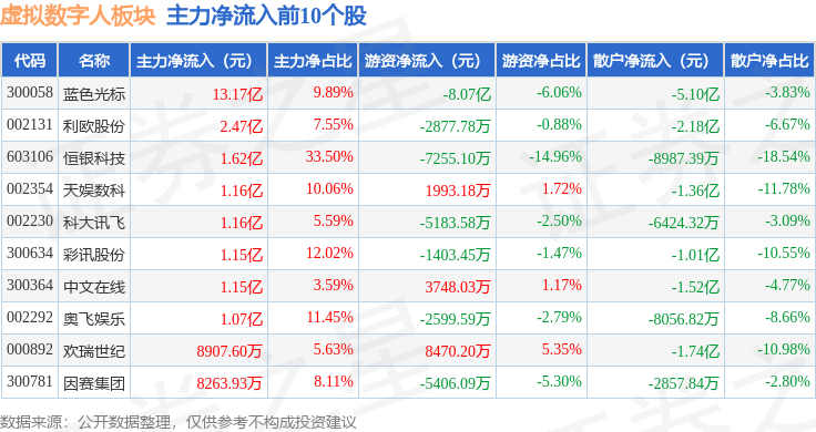 从资金流向上来看,当日虚拟数字人板块主力资金净流入27.84亿元,游资资金净流出11.12亿元,散户资金净流出16.73亿元。虚拟数字人板块个股资金流向见下表: