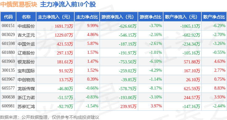 从资金流向上来看,当日中俄贸易板块主力资金净流出1836.85万元,游资资金净流出1421.91万元,散户资金净流入3258.76万元。中俄贸易板块个股资金流向见下表: