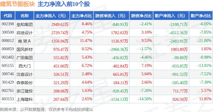 从资金流向上来看,当日建筑节能板块主力资金净流出6213.4万元,游资资金净流出2160.12万元,散户资金净流入8373.53万元。建筑节能板块个股资金流向见下表: