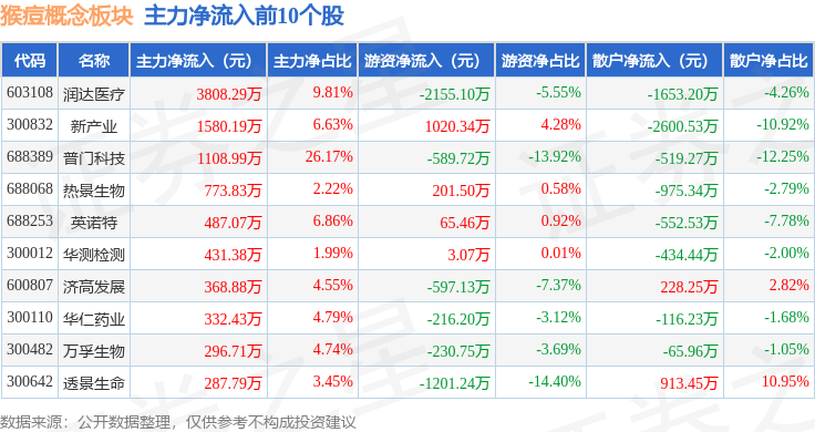 从资金流向上来看,当日猴痘概念板块主力资金净流出1.2亿元,游资资金净流出1.1亿元,散户资金净流入2.3亿元。猴痘概念板块个股资金流向见下表: