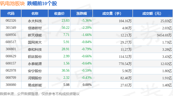 从资金流向上来看,当日钒电池板块主力资金净流出1.1亿元,游资资金净流出3519.22万元,散户资金净流入1.45亿元。钒电池板块个股资金流向见下表: