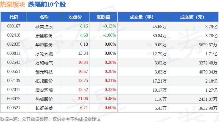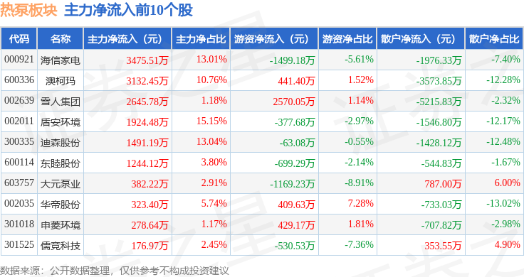 从资金流向上来看,当日热泵板块主力资金净流出8692.82万元,游资资金净流入4196.15万元,散户资金净流入4496.67万元。热泵板块个股资金流向见下表: