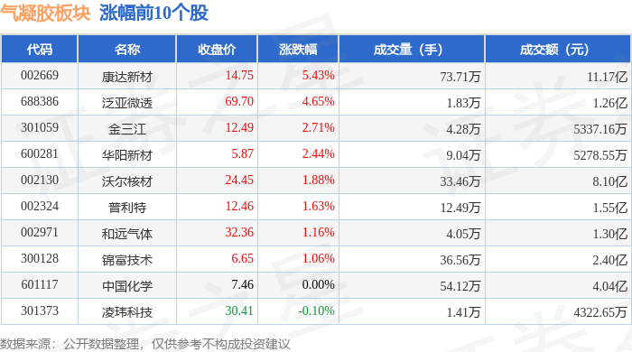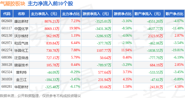 从资金流向上来看,当日气凝胶板块主力资金净流出1.19亿元,游资资金净流出5508.96万元,散户资金净流入1.74亿元。气凝胶板块个股资金流向见下表: