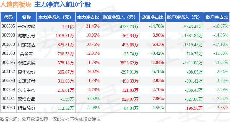 从资金流向上来看,当日人造肉板块主力资金净流出1.47亿元,游资资金净流入2317.69万元,散户资金净流入1.24亿元。人造肉板块个股资金流向见下表: