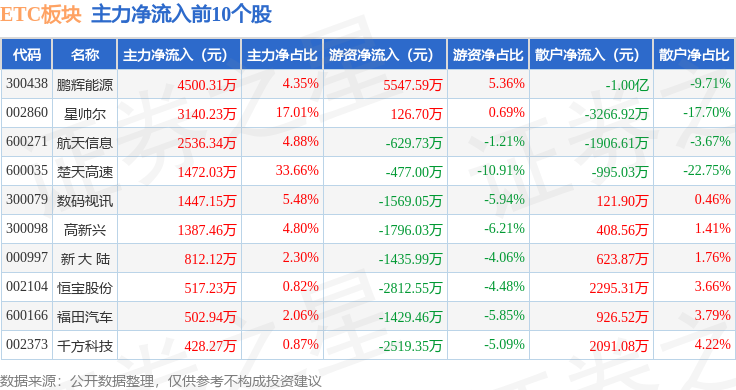 从资金流向上来看,当日ETC板块主力资金净流出4.39亿元,游资资金净流出7304.24万元,散户资金净流入5.12亿元。ETC板块个股资金流向见下表: