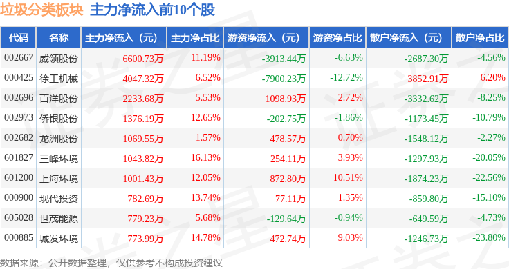 从资金流向上来看,当日垃圾分类板块主力资金净流出3.79亿元,游资资金净流出2361.57万元,散户资金净流入4.02亿元。垃圾分类板块个股资金流向见下表: