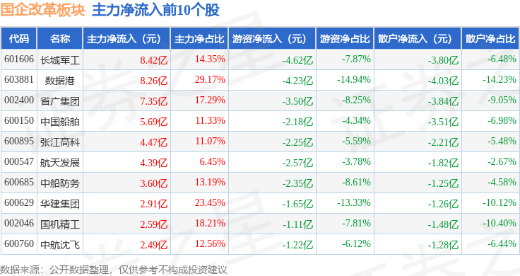 从资金流向上来看,当日国企改革板块主力资金净流入50.05亿元,游资资金净流出42.9亿元,散户资金净流出7.15亿元。国企改革板块个股资金流向见下表: