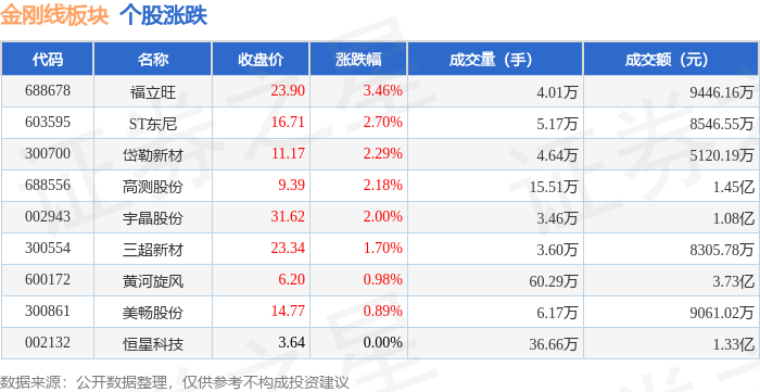 从资金流向上来看,当日金刚线板块主力资金净流出3239.2万元,游资资金净流出1288.51万元,散户资金净流入4527.71万元。金刚线板块个股资金流向见下表: