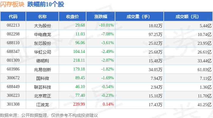 从资金流向上来看,当日闪存板块主力资金净流出13.32亿元,游资资金净流出2.61亿元,散户资金净流入15.93亿元。闪存板块个股资金流向见下表:
