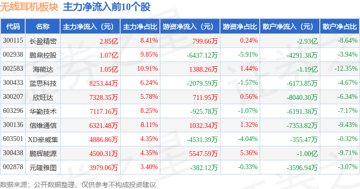 从资金流向上来看,当日无线耳机板块主力资金净流出7.79亿元,游资资金净流出8474.27万元,散户资金净流入8.64亿元。无线耳机板块个股资金流向见下表: