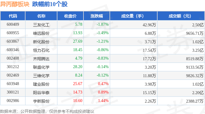 证券之星消息,11月24日异丙醇板块较上一交易日下跌0.25%,三友化工领跌。当日上证指数报收于3836.77,上涨0.05%。深证成指报收于12585.08,上涨0.37%。异丙醇板块个股涨跌见下表:
