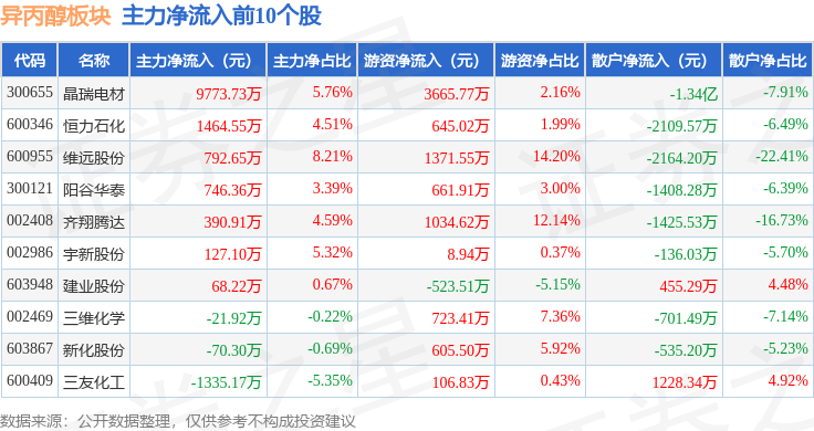 从资金流向上来看,当日异丙醇板块主力资金净流入2852.31万元,游资资金净流入6600.66万元,散户资金净流出9452.96万元。异丙醇板块个股资金流向见下表: