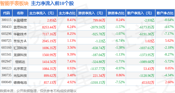 从资金流向上来看,当日智能手表板块主力资金净流入2.96亿元,游资资金净流出2.04亿元,散户资金净流出9126.21万元。智能手表板块个股资金流向见下表: