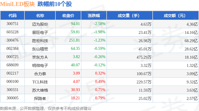 从资金流向上来看,当日MiniLED板块主力资金净流出2.09亿元,游资资金净流出8466.66万元,散户资金净流入2.94亿元。MiniLED板块个股资金流向见下表: