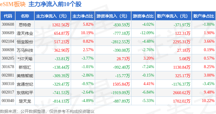 从资金流向上来看,当日eSIM板块主力资金净流出8959.38万元,游资资金净流出3003.03万元,散户资金净流入1.2亿元。eSIM板块个股资金流向见下表: