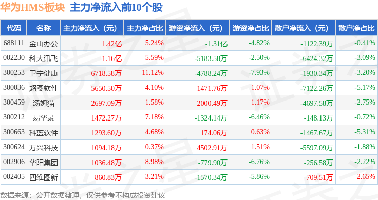 从资金流向上来看,当日华为HMS板块主力资金净流出5693.67万元,游资资金净流出2.34亿元,散户资金净流入2.91亿元。华为HMS板块个股资金流向见下表: