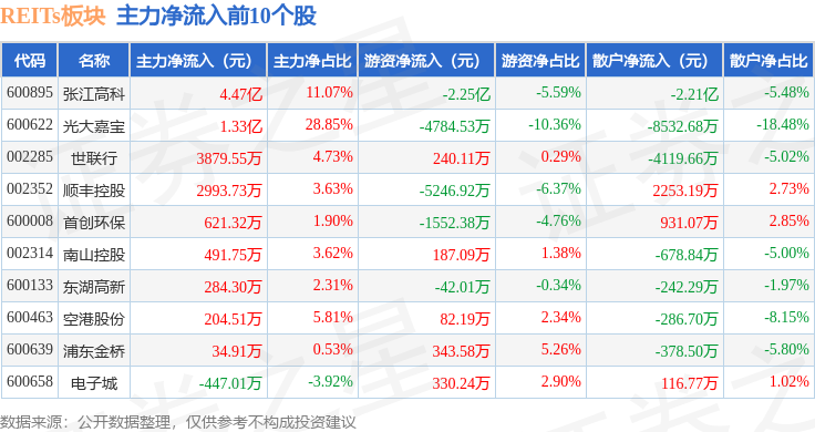 从资金流向上来看,当日REITs板块主力资金净流入5.78亿元,游资资金净流出3.21亿元,散户资金净流出2.57亿元。REITs板块个股资金流向见下表:
