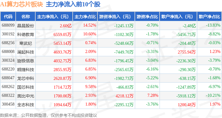 从资金流向上来看,当日AI算力芯片板块主力资金净流入4.23亿元,游资资金净流出1.84亿元,散户资金净流出2.39亿元。AI算力芯片板块个股资金流向见下表: