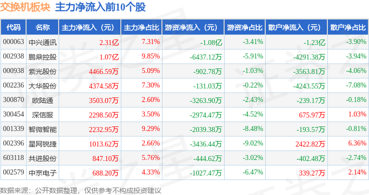 从资金流向上来看,当日交换机板块主力资金净流入1.01亿元,游资资金净流出4.45亿元,散户资金净流入3.44亿元。交换机板块个股资金流向见下表: