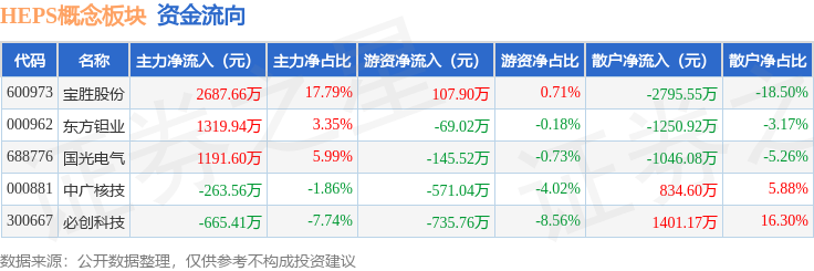 从资金流向上来看,当日HEPS概念板块主力资金净流入4270.23万元,游资资金净流出1413.45万元,散户资金净流出2856.77万元。HEPS概念板块个股资金流向见下表:
