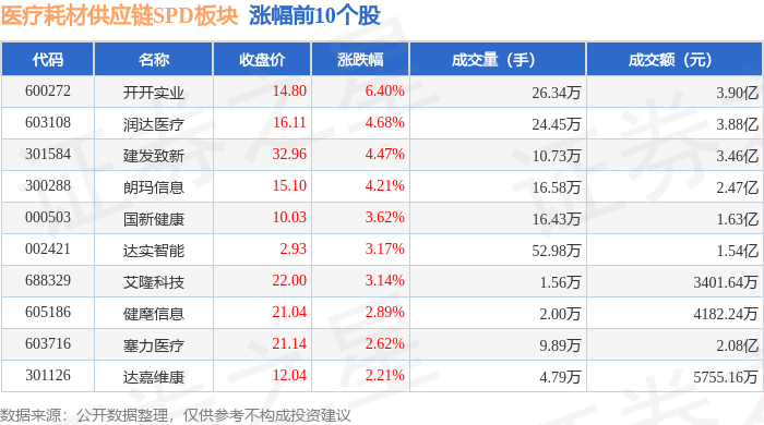 证券之星消息,11月24日医疗耗材供应链SPD板块较上一交易日上涨1.19%,开开实业领涨。当日上证指数报收于3836.77,上涨0.05%。深证成指报收于12585.08,上涨0.37%。医疗耗材供应链SPD板块个股涨跌见下表: