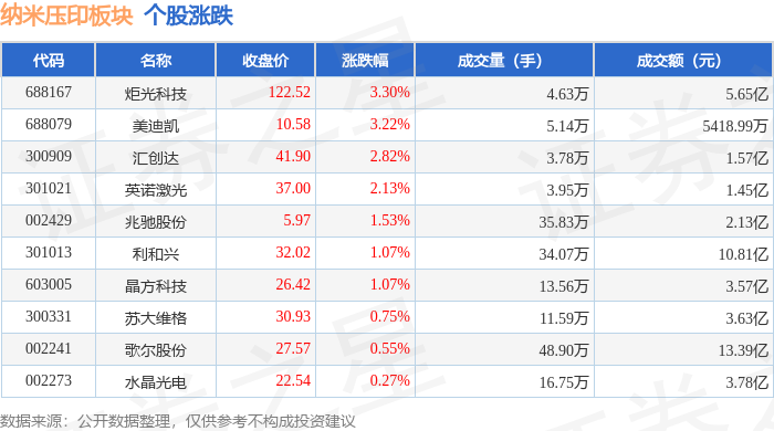 证券之星消息,11月24日纳米压印板块较上一交易日上涨1.01%,炬光科技领涨。当日上证指数报收于3836.77,上涨0.05%。深证成指报收于12585.08,上涨0.37%。纳米压印板块个股涨跌见下表: