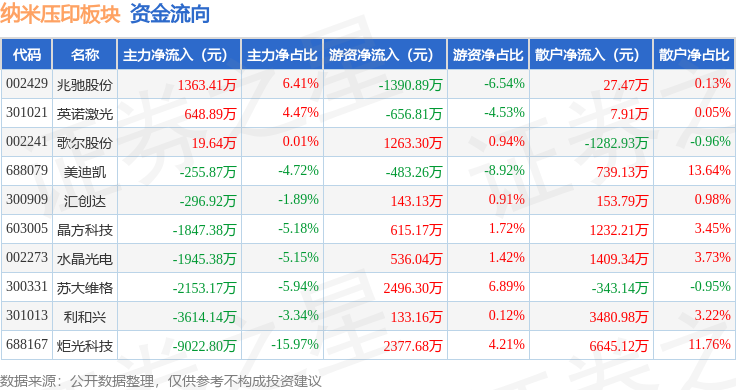 从资金流向上来看,当日纳米压印板块主力资金净流出1.71亿元,游资资金净流入5033.81万元,散户资金净流入1.21亿元。纳米压印板块个股资金流向见下表: