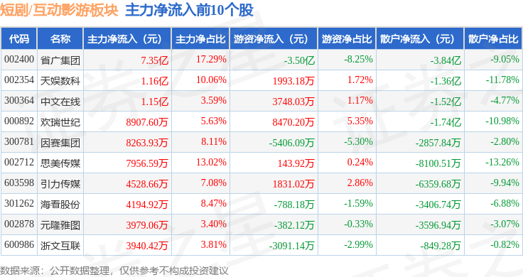 从资金流向上来看,当日短剧/互动影游板块主力资金净流入13.86亿元,游资资金净流出5.14亿元,散户资金净流出8.72亿元。短剧/互动影游板块个股资金流向见下表:
