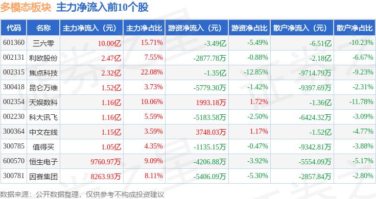 从资金流向上来看,当日多模态板块主力资金净流入8.63亿元,游资资金净流出2.0亿元,散户资金净流出6.63亿元。多模态板块个股资金流向见下表: