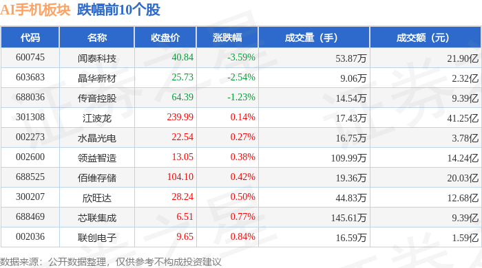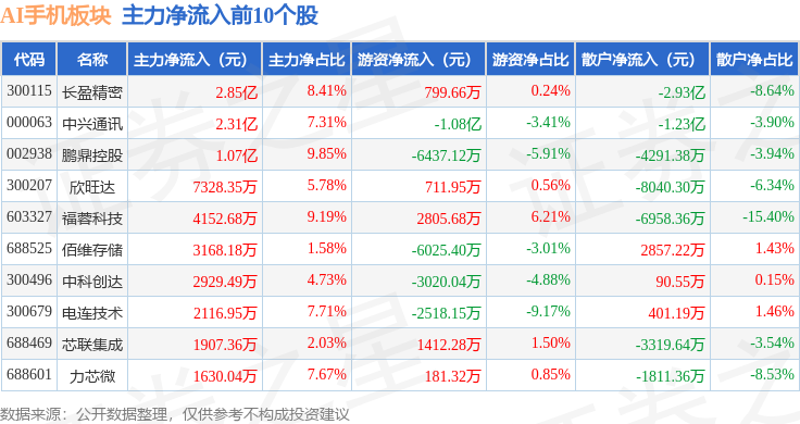 从资金流向上来看,当日AI手机板块主力资金净流入1.9亿元,游资资金净流出1.16亿元,散户资金净流出7464.07万元。AI手机板块个股资金流向见下表:
