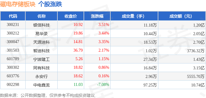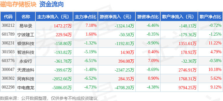 从资金流向上来看,当日磁电存储板块主力资金净流出6550.58万元,游资资金净流出8929.64万元,散户资金净流入1.55亿元。磁电存储板块个股资金流向见下表: