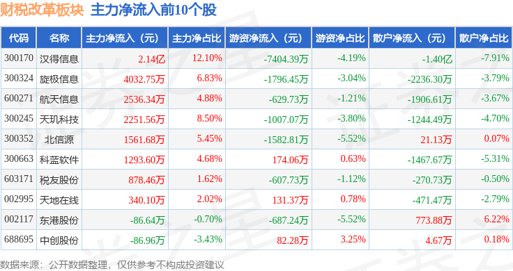 从资金流向上来看,当日财税改革板块主力资金净流出6.16亿元,游资资金净流出6652.54万元,散户资金净流入6.82亿元。财税改革板块个股资金流向见下表: