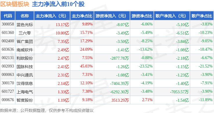 从资金流向上来看,当日区块链板块主力资金净流入20.63亿元,游资资金净流出26.22亿元,散户资金净流入5.59亿元。区块链板块个股资金流向见下表: