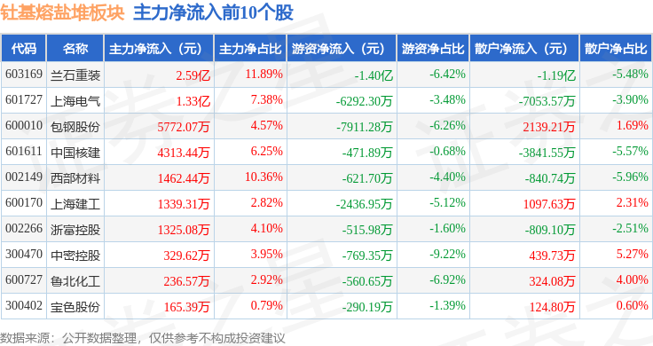 从资金流向上来看,当日钍基熔盐堆板块主力资金净流入2.44亿元,游资资金净流出3.95亿元,散户资金净流入1.51亿元。钍基熔盐堆板块个股资金流向见下表: