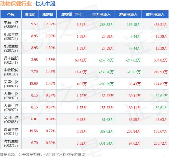个股表现方面,动物保健行业当日领涨股为申联生物(688098),该股当日报收9.57,上涨2.57%,成交量5.51万,主力资金净流出288.33万元。永顺生物(920729)以上涨1.59%紧随其后,该股当日成交量1.59万,主力资金净流入27.59万元。除此之外,永顺生物(920729)、贤丰控股(002141)、中牧股份(600195)均进入当日牛股之列。具体个股列表见下表: