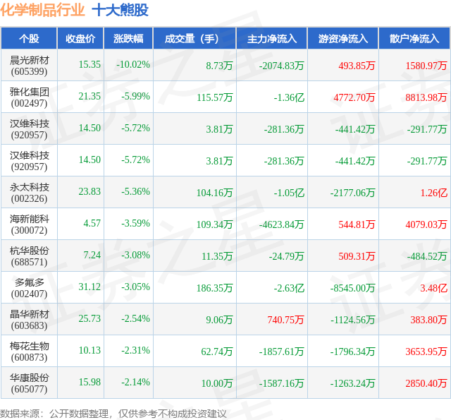 个股表现方面,化学制品行业当日领跌股为晨光新材(605399),该股当日报收15.35,下跌10.02%,成交量8.73万,主力资金净流出2074.83万元。雅化集团(002497)以下跌5.99%紧随其后,该股当日成交量115.57万,主力资金净流出1.36亿元。除此之外,汉维科技(920957)、汉维科技(920957)、永太科技(002326)均进入当日熊股之列。具体个股列表见下表: